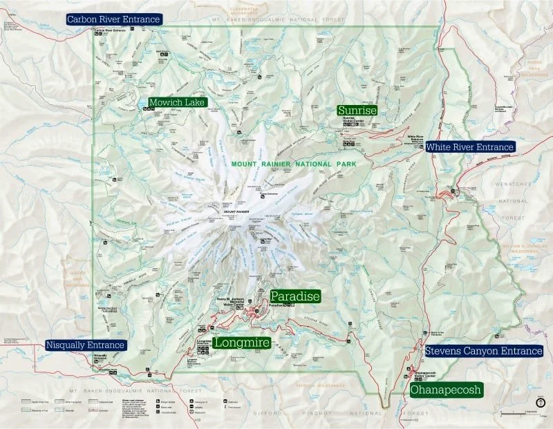 Map of Mount Rainier National Park and park entrances.